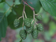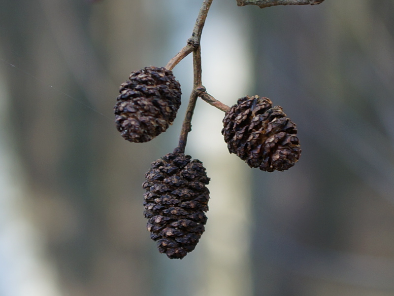 Owoce olszy przypominają małe szyszeczki wielkości 1 - 2 cm. Początkowo ciemno zielone, później brązowieją i drewnieją. Szyszeczki zawierają małe lekko oskrzydlone orzeszki, które po zdrewnieniu i otwarciu owocostanu, rozsiewane są przez wiatr. Puste szyszeczki jeszcze długo utrzymują się na drzewie. |
