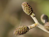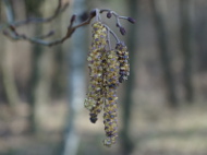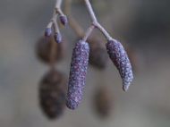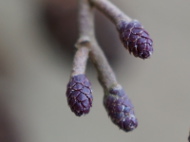 Kwiaty męskie zebrane w kilkucentymetrowe kotki pojawiają się latem, utrzymują się na drzewie przez całą zimę i ostatecznie rozwijają się na wiosnę. Zimą jeszcze nie rozwinięte koloru bordowo – niebieskiego. Wiosną, po rozwinięciu żółto brązowo fioletowe. Umieszczone na zdrewniałej szypułce. |