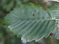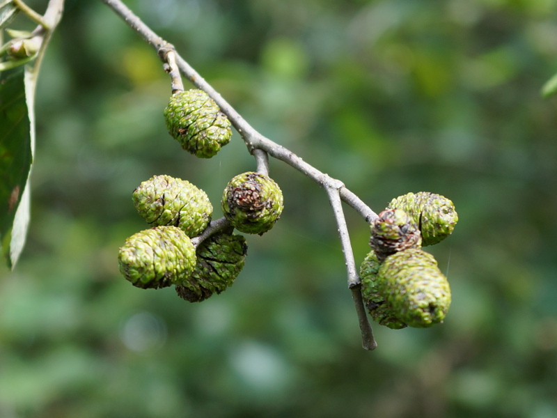 Liście elipsoidalne zakończone czubkiem, podwójnie piłkowane, na dosyć krótkim ogonku. Wierzchnia strona gładka ciemno zielona, spodnia jaśniejsza z wyraźnie widocznym unerwieniem. Nasiona umieszczone są w charakterystycznych jajowatych szyszeczkach wielkości ok 1 cm. Początkowo zielone, po otwarciu brązowieją. Szyszeczki umieszczone są na bardzo krótkich ogonkach. |