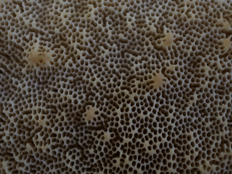 Spodnia strona biała u starych osobników ciemnieje do kremowej, jasno brązowej. Pory okrągłe, elipsoidalne rozmieszczone nieregularnie.