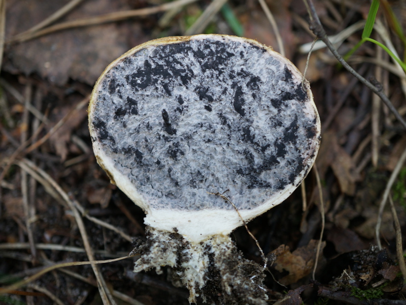 Po przekrojeniu widoczne czarno-białe wnętrze o nieregularnych wzorach. Im młodszy osobnik tym więcej jest białego u starszych dominuje czarny.